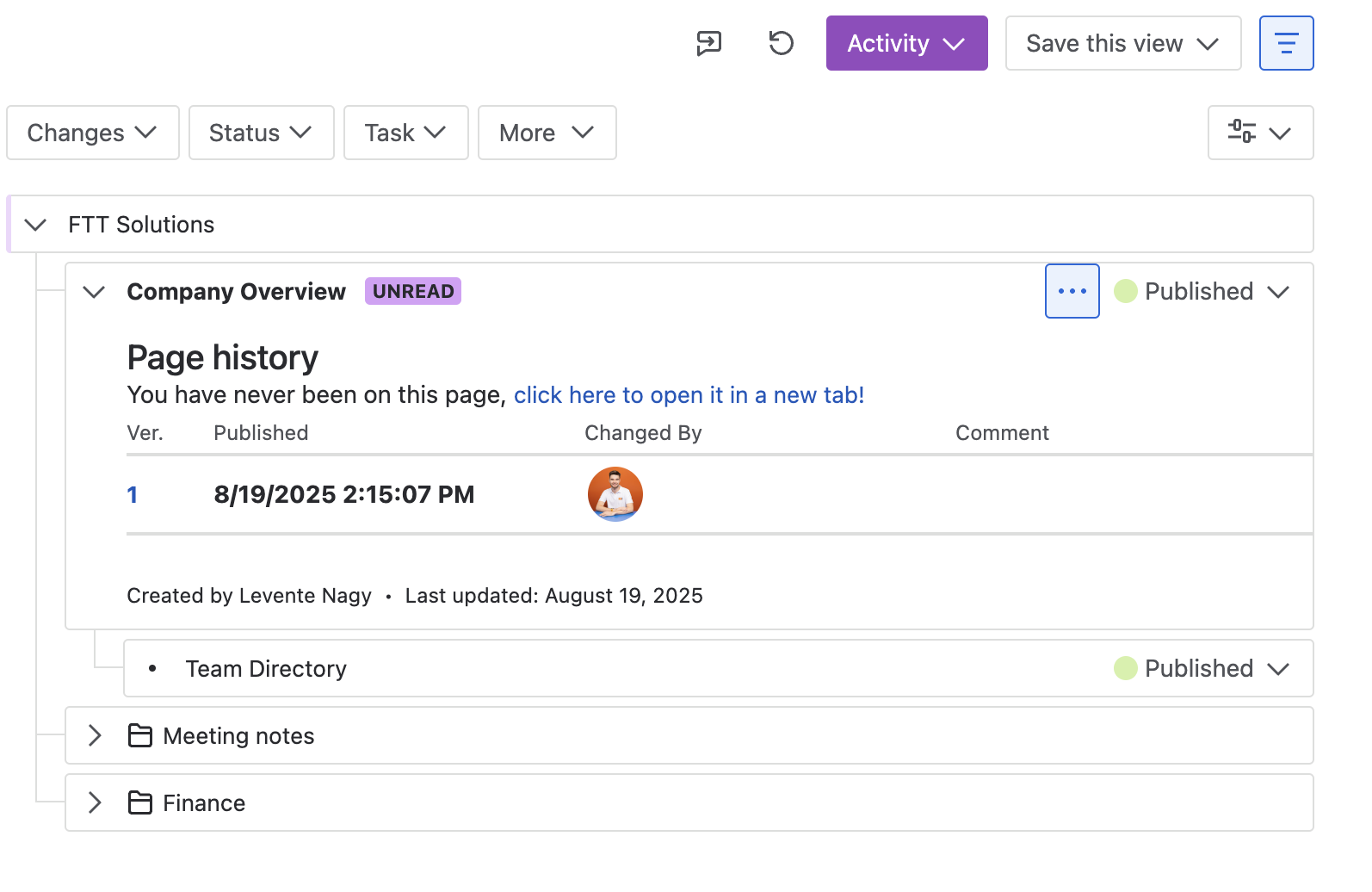 Keeping control over rapidly changing documentation is challenging in itself. Confluence keeps track of every change by creating a new version of the page in the [page history](https://support.atlassian.com/confluence-cloud/docs/create-edit-and-publish-a-page/#Page-versions-and-history). It is accessible from the page tree by opening the <mark style="color:green;">Page history pane</mark>l from the context menu.
