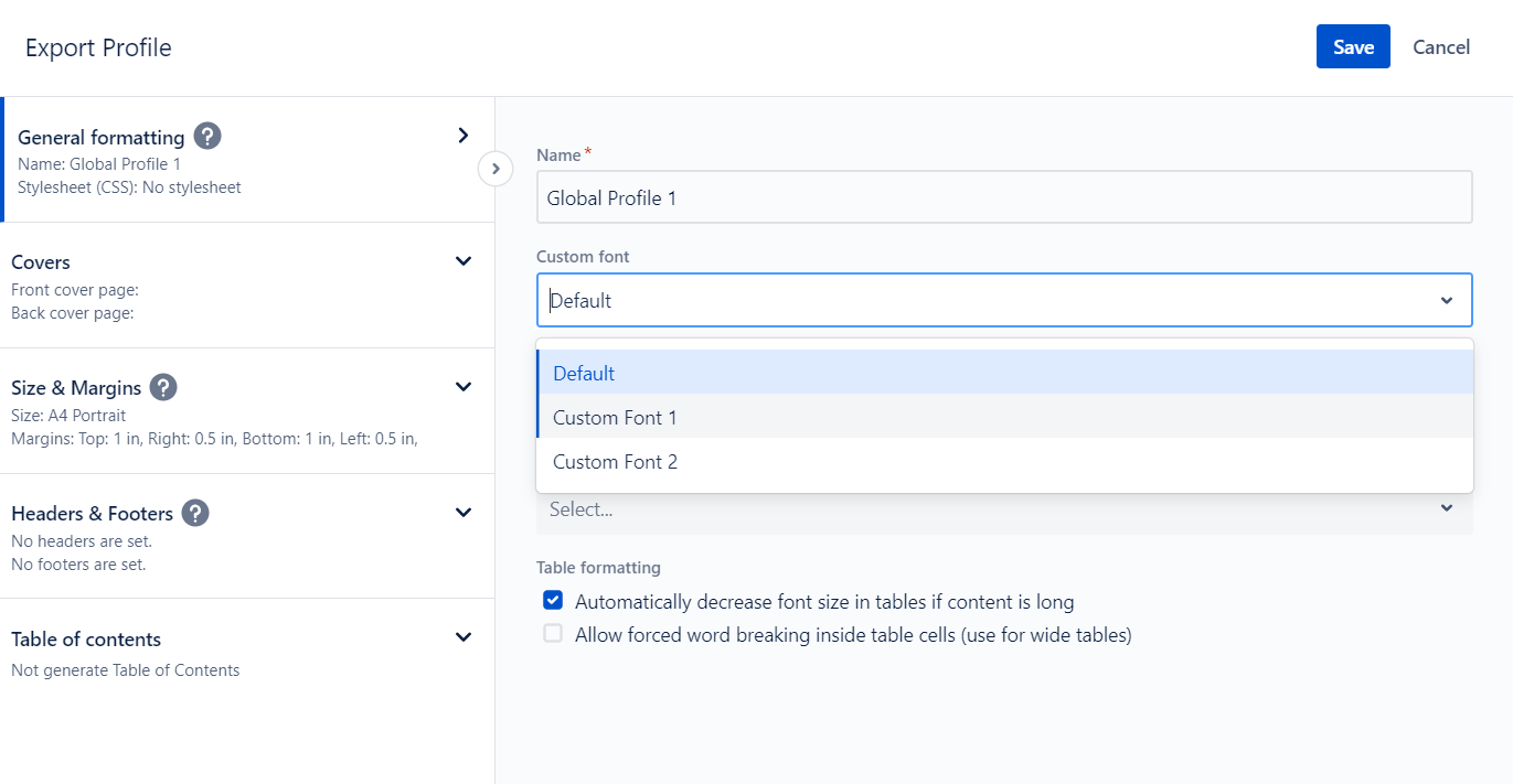 Any previously uploaded font can be selected. Read more about it in [PDF Custom Fonts](https://docs.meta-inf.hu/content-exporter-confluence/user-guides/before-exporting/pdf-custom-fonts).