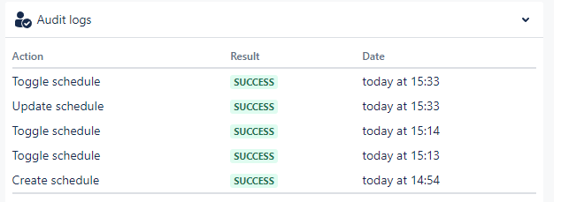 One of the following actions: - Create schedule - Update schedule - Toggle schedule - Delete schedule